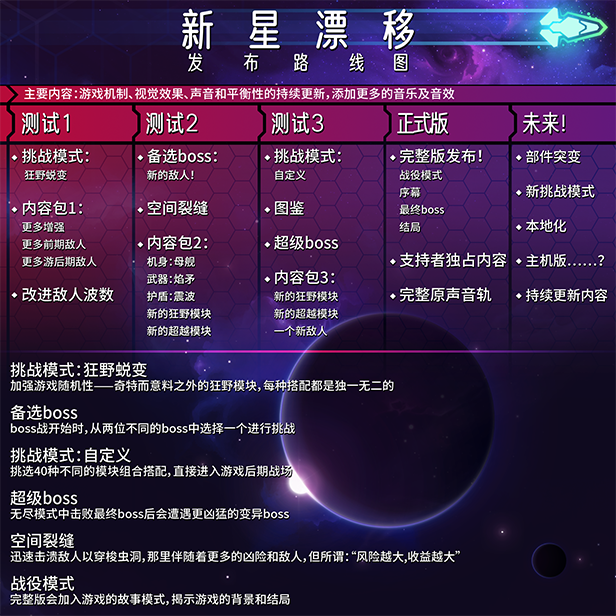 《新星漂移》是一款一款持续开发中的游戏,我们会频繁更新以扩展游戏深度和内容。