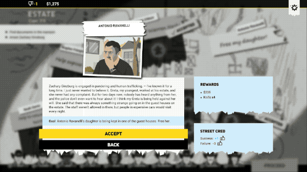 你们在打一场游击战,人手和装备都全面落后。利用隐蔽和掩护,悄悄接近敌人,并在他们能够发出警报之前将其击倒。你有一个非致命武器和装备的军火库,以及一些特殊的战术特技,你可以在升级义军时解锁它们。的确,有时候暴力似乎是在所难免的,但到了那个关头时,便不要有半点犹豫:你和罪犯都没有生命条。当有人被射中时,他会很快因失血过多而死,头部被子弹击中则意味着立即死亡。