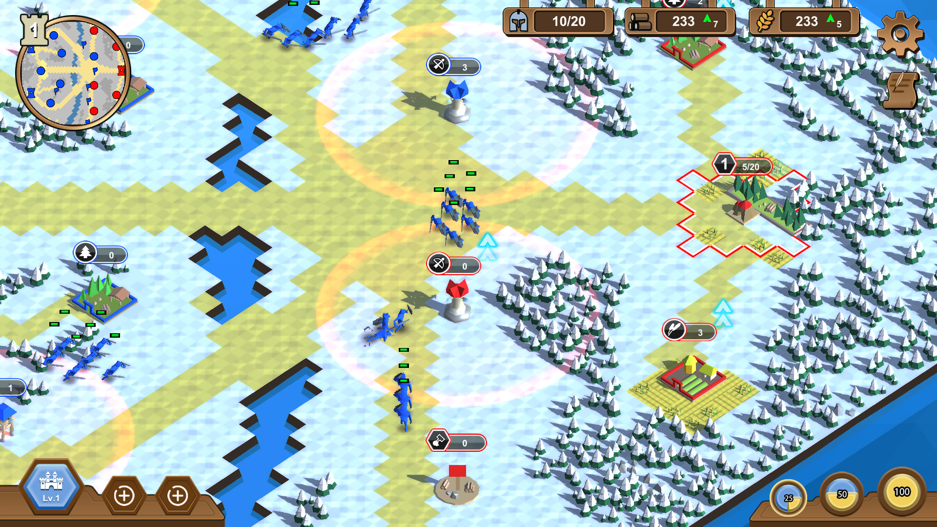 你可以可建造伐木场、农田、兵营,获得木材、粮食、士兵数,木材用于建造升级,粮食用于产出士兵,兵营用于训练士兵,所以这就需要玩家在这三种建筑和资源中相互权衡,以此达到最优的策略方针。