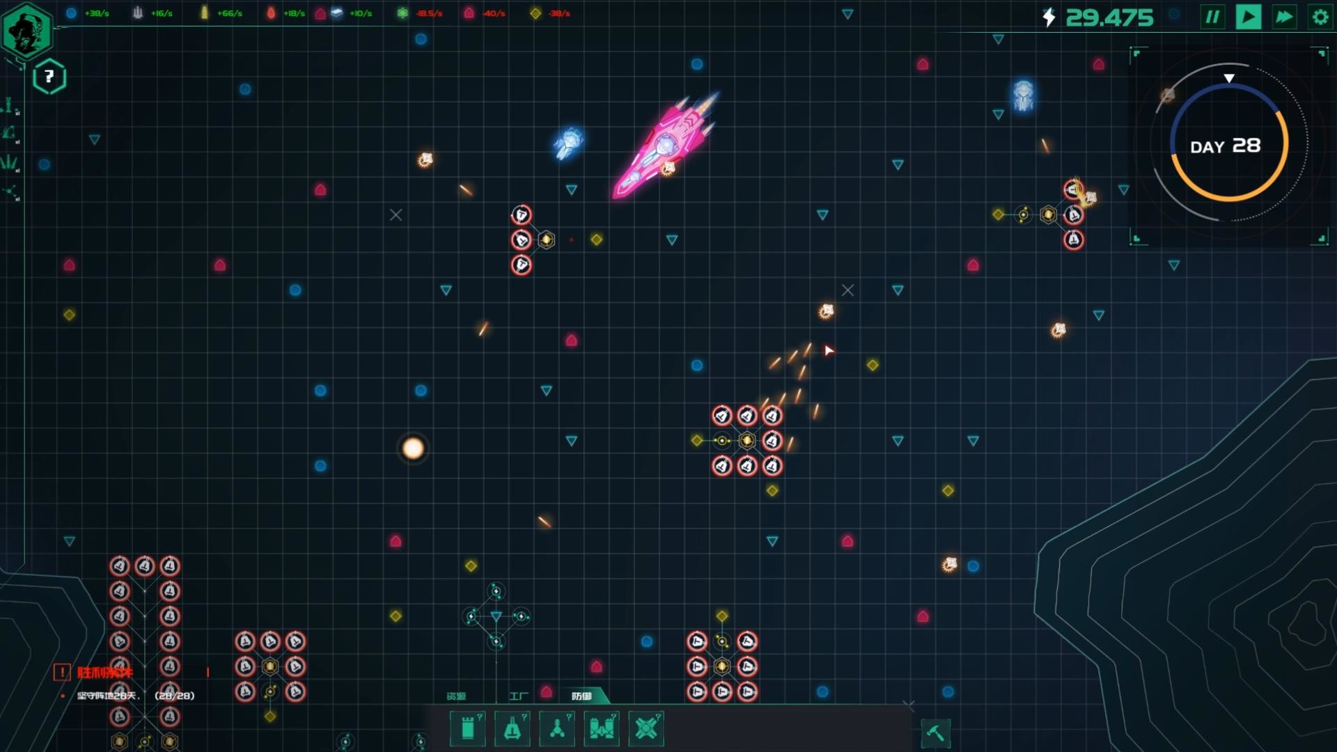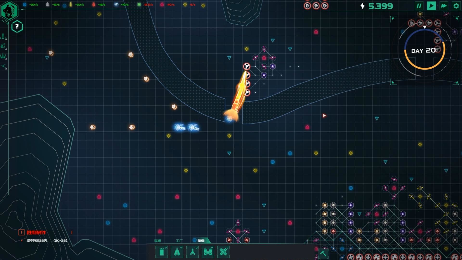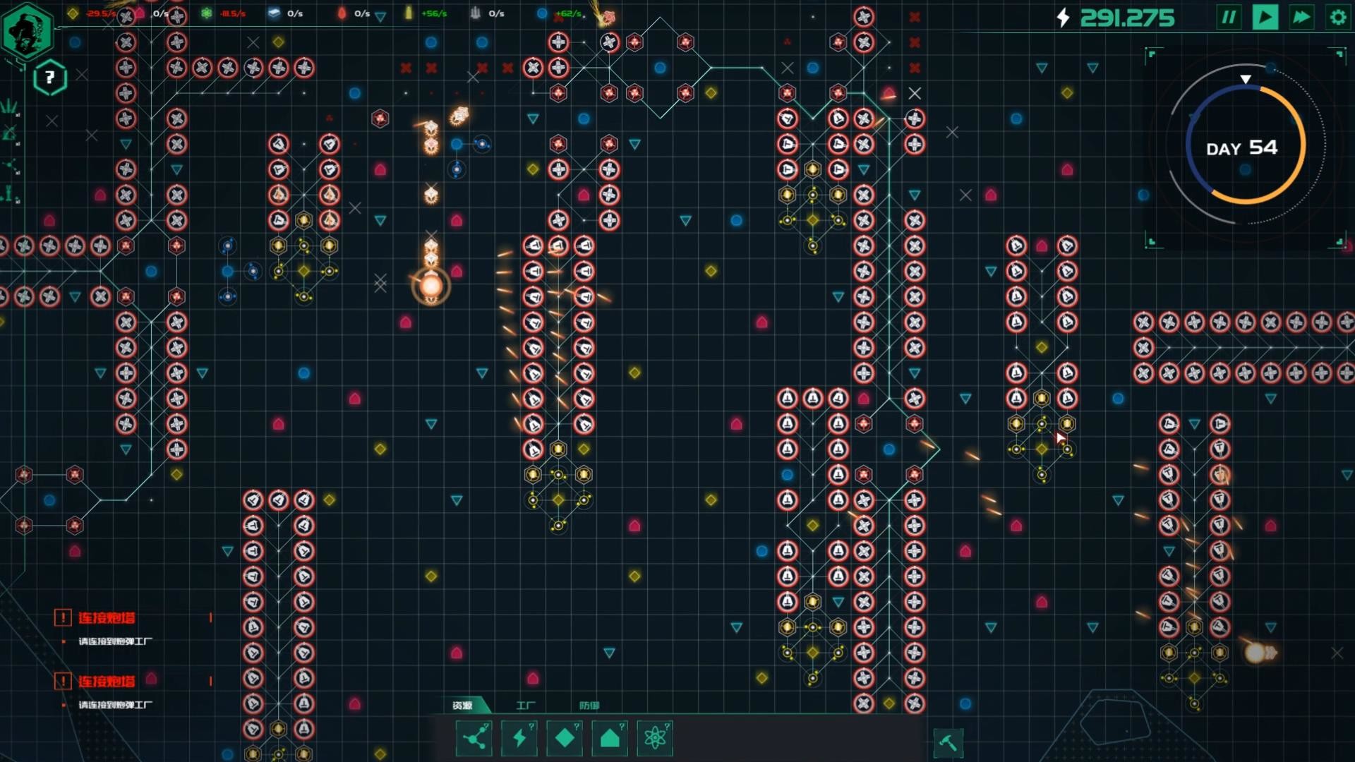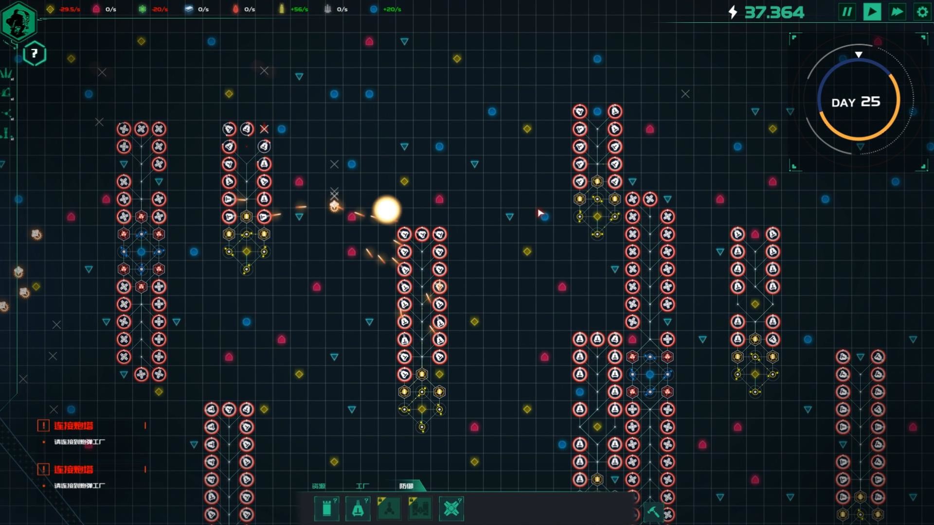 您需要建造资源采集器,采集地图上的各种资源,然后建造工厂,将资源转换成各种所需的战略物资,合理分配线路,利用战略物资建造防御工事,抵御敌人的进攻
