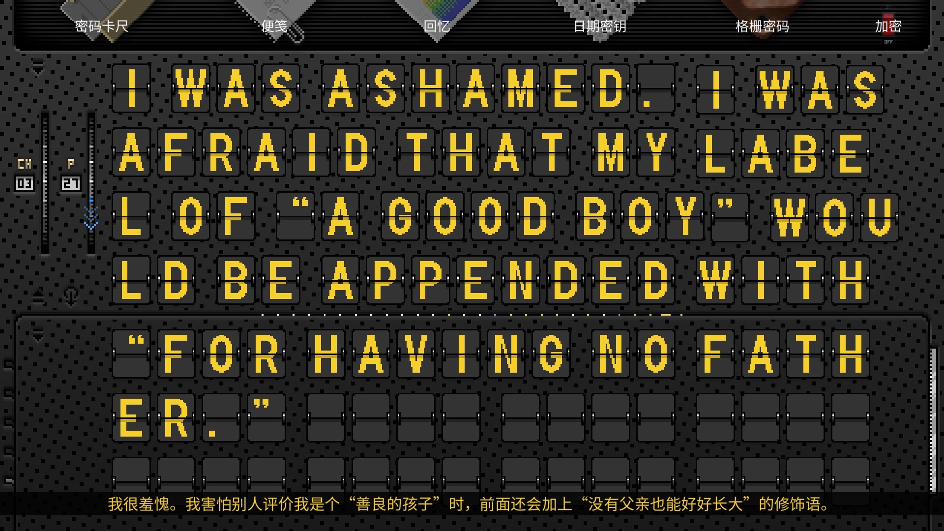 玩家只有在破译之后才能获悉真相,并感受作者埋藏在字里行间的深沉情感。