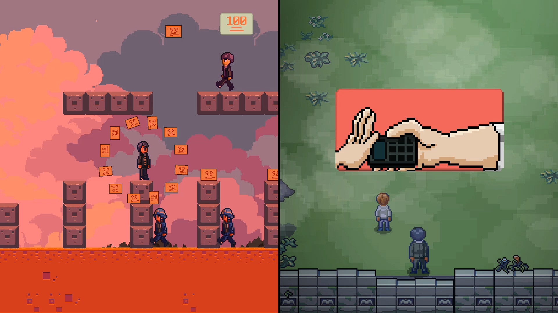 “我”需要控制屏幕两边的两个身体去做事和对话,内心独白会冒出在屏幕下方,有时需要完成互动和小游戏。