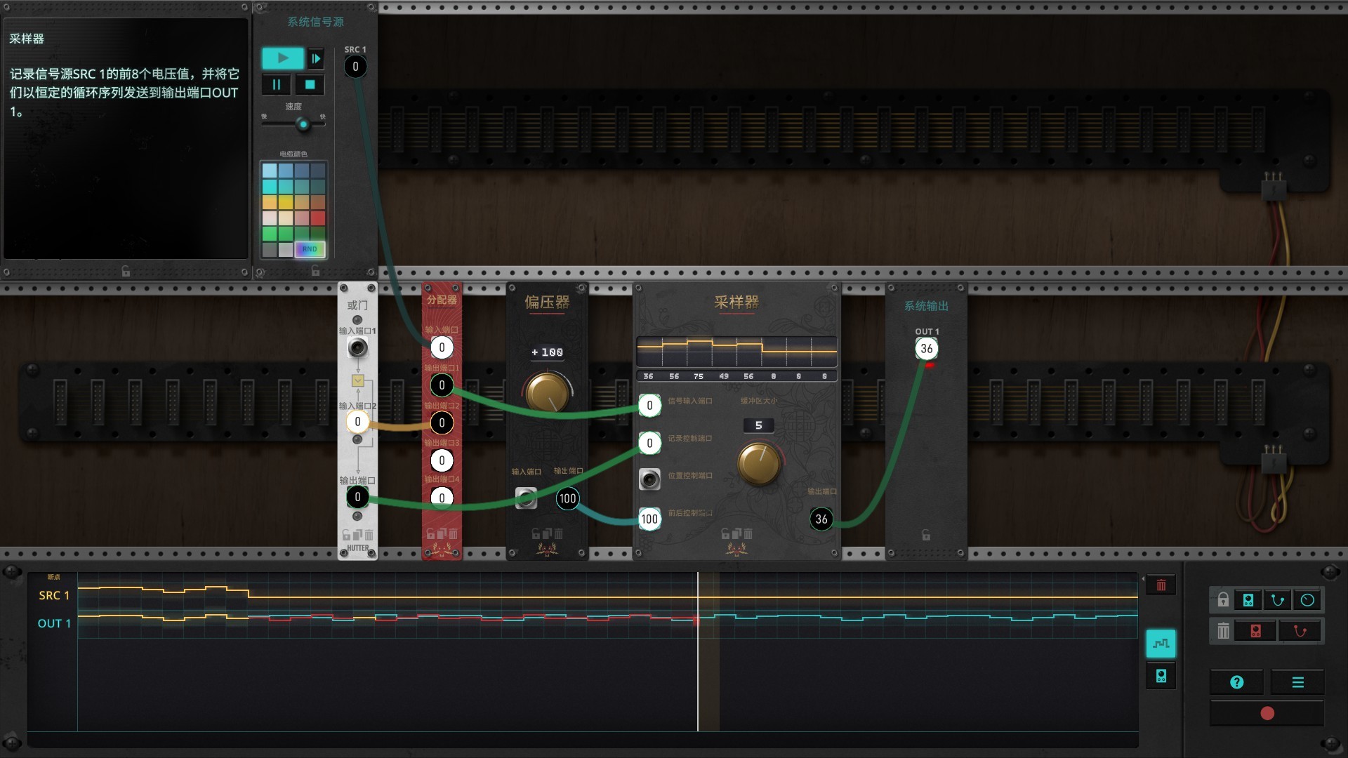通过简明的拖拽操作来布设模块元件,连接线缆,来操纵输入信号。