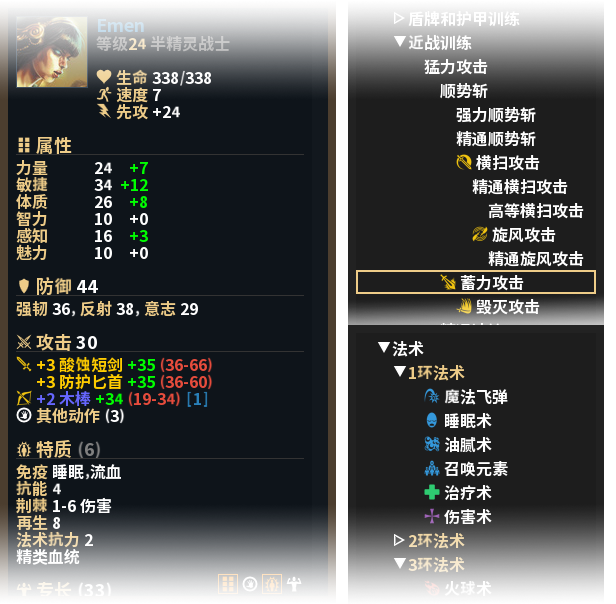• 精心设计的技能/法术:战系专有的各种范围武器技,打破了传统战士只会平砍的尴尬局面;精选并强化的睡眠术/油腻术/召唤元素等各种奥术/神术,让玩家在面对同一战况时有多种解决方案;各种怪物特有能力及其造成的变形/恐惧/疯狂/魅惑等特殊状态,使战斗始终保持一定的挑战性。