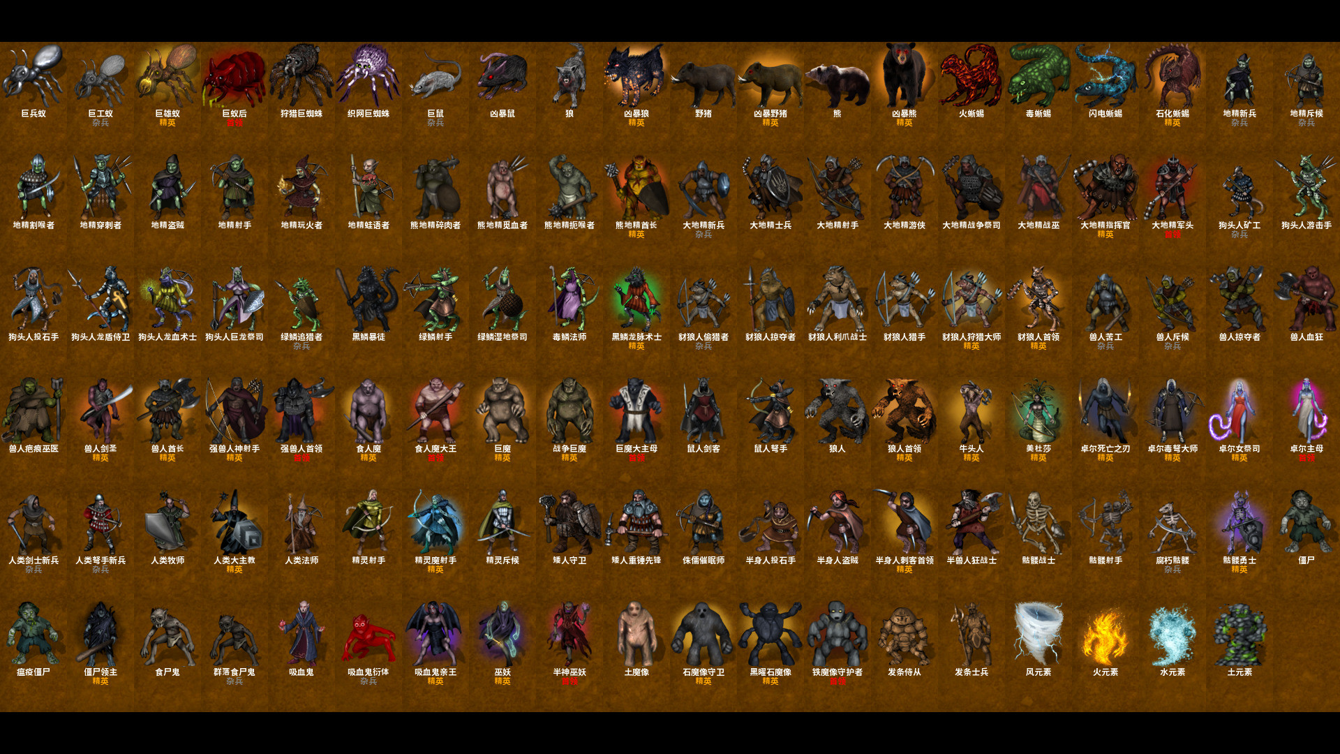 • 各种经典奇幻怪物:分属7大类型,41个种族,共计119种经典奇幻怪物。从地精到巨魔,从巨蚁到石化蜥蜴;由卓尔主母带领的卓尔精灵精英战队,或是在巫妖与吸血鬼亲王统领下的不死大军。不同的怪物种群需要不同的战略战术去面对。