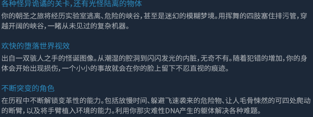 独立操控每条手臂,抓住你所看到的任何东西,从可疑的操纵杆到悬垂的眼球,无奇不有。战胜各种物理挑战,在此过程中你可能会失去手臂(不要担心,它们会长回来)。
