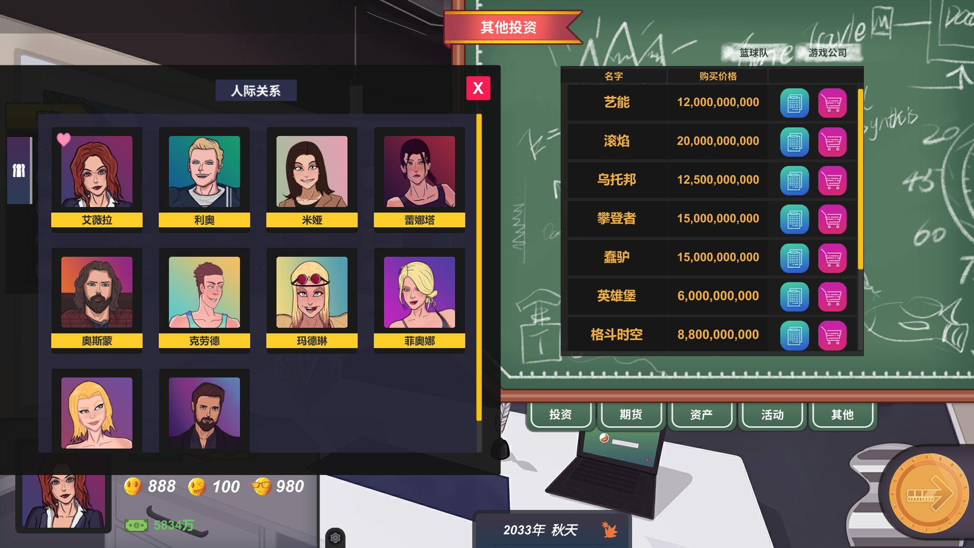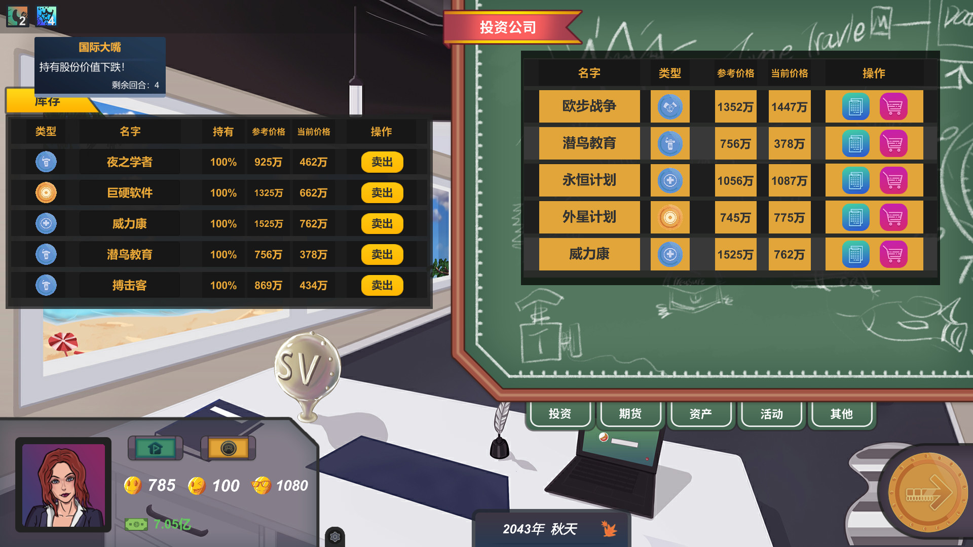 你将面对数以百计,正在寻求投资的公司。他们大都千奇百怪,抓住这些机会,从中赚取金钱提高你的身价。当然期货也是非常值得投资的。在各项投资和自身资源之间取得平衡,并将你的生意进一步拓展,这就是你要做的事。