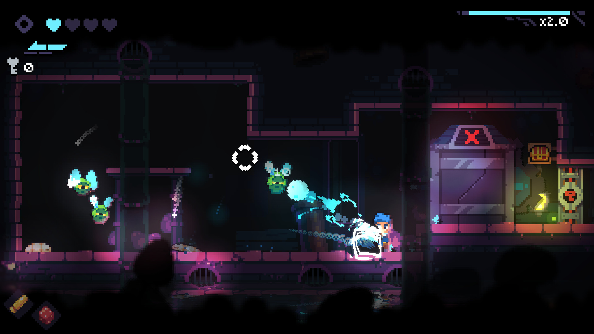 双摇杆射击、冲刺与攀墙滑步只是游戏的入门玩法,在每一局游戏中寻找强化装备与物品,充实你的武库。