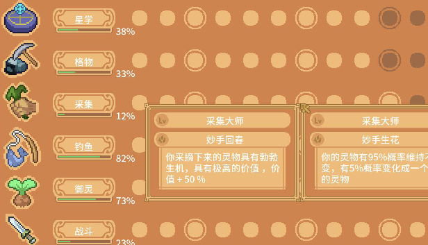 玩家人物拥有六项技能:星学、钓鱼、格物、御灵、战斗、采集,每一项达到一定等级都能解锁特殊的天赋,总共达到一定程度后甚至能够解锁失落的神器...