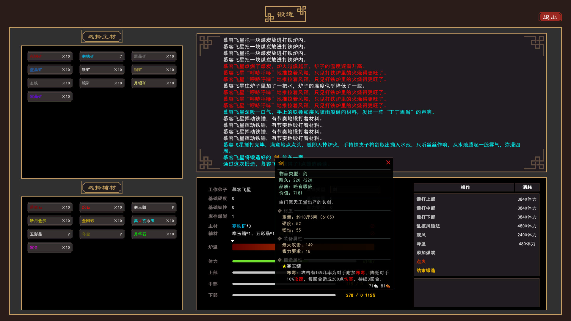 游戏提供了多种不同等级的武学(将不断添加),你可以在游历过程中通过任务、解谜甚至偷盗等方式获得。不同的武学对修炼者的天性和天赋有不同要求,你可以选择合适的武学搭配来提升弟子的战斗力。