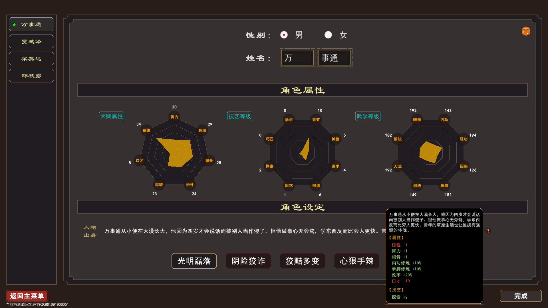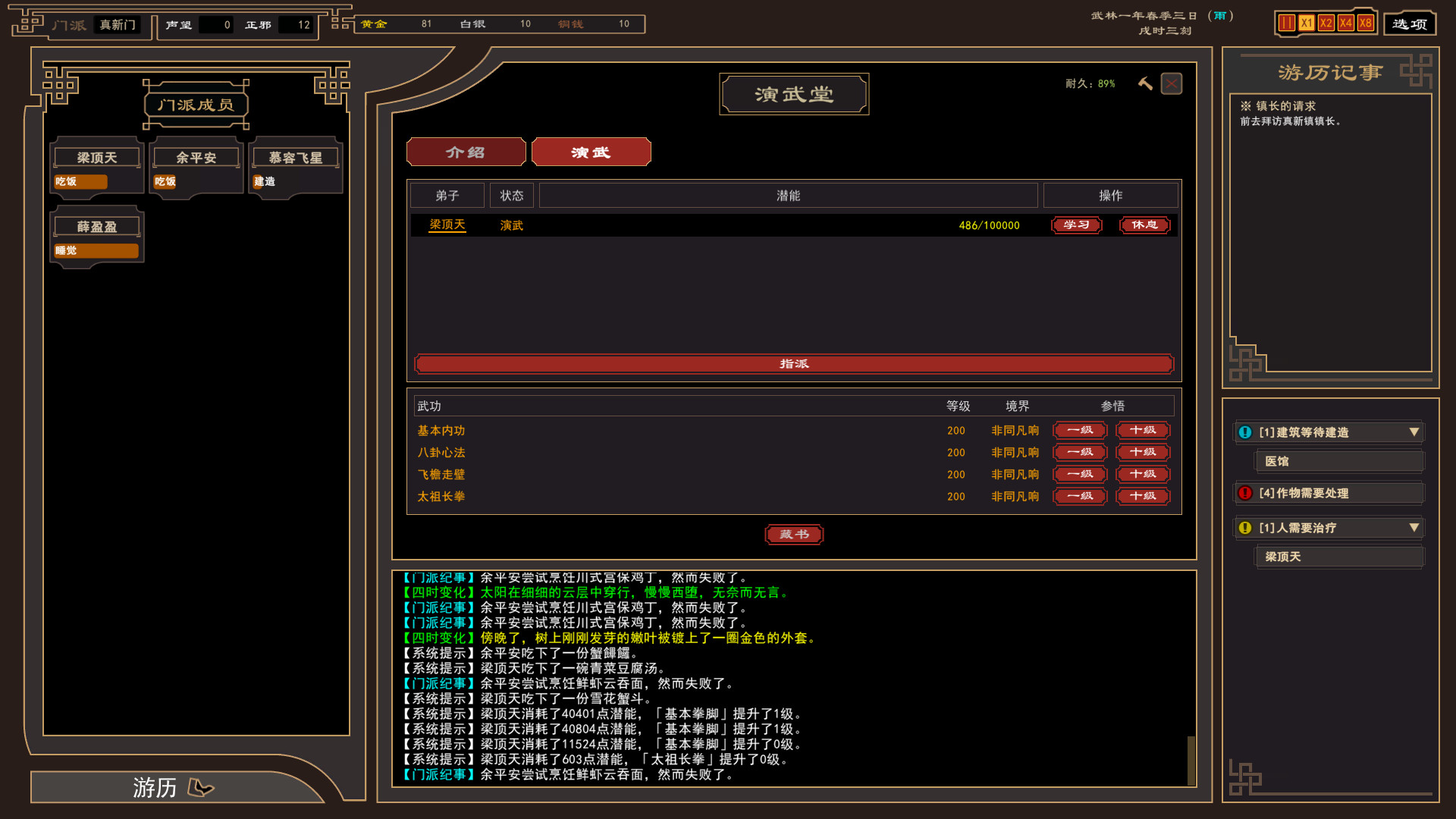 你可以招收心仪的弟子,每个弟子都有不同的人物经历和天赋属性