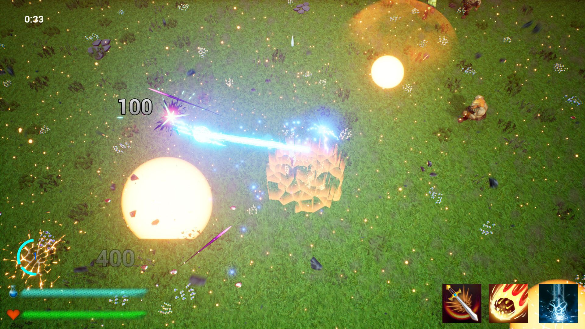 用魔法轰杀兽人获得经验,升级分属火电水刃暗5个系列的数十种主动和被动技能。