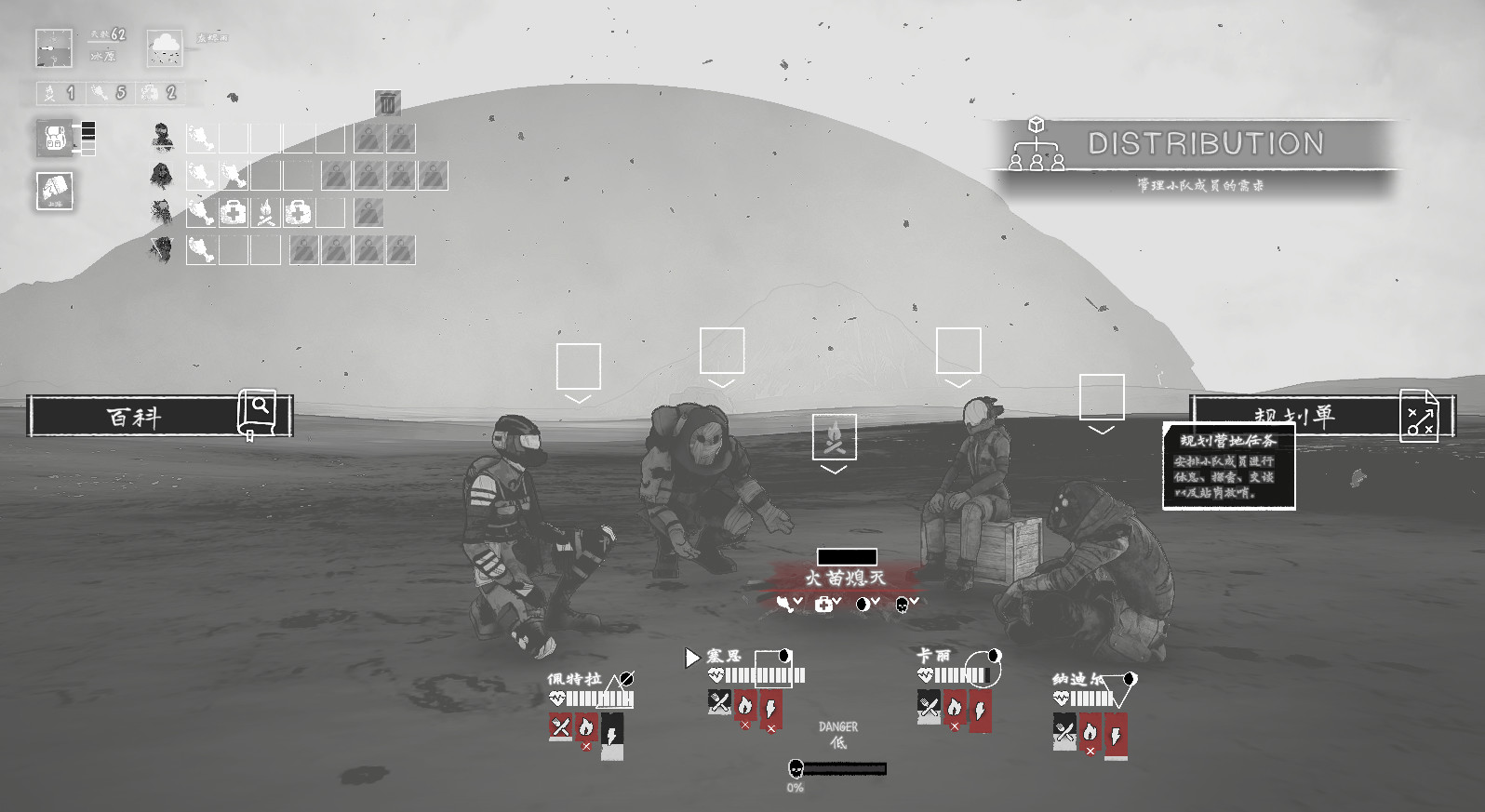 队伍中有勇敢的队长佩特拉、务实的战士塞恩、年轻而乐观的学者卡丽和警惕的侦察兵纳迪尔。你可以一边在烬土世界中探索,一边了解他们之间的互动与关系。
