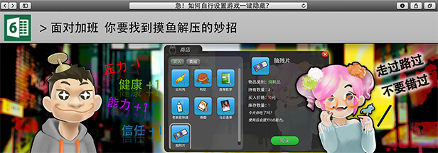\r\n游戏中的主要角色们拥有截然不同的性格爱好,也有各自不同的故事和归宿。你可以通过聊天、送礼等各种形式,逐渐走入他们的内(shen)心(ti)。作为回报,他们可以教会你一些职场生存技能。不过,职场危机四伏,想要保住饭碗,你需要收集更多东西以求自保,请务必记得多多流连于小卖部。