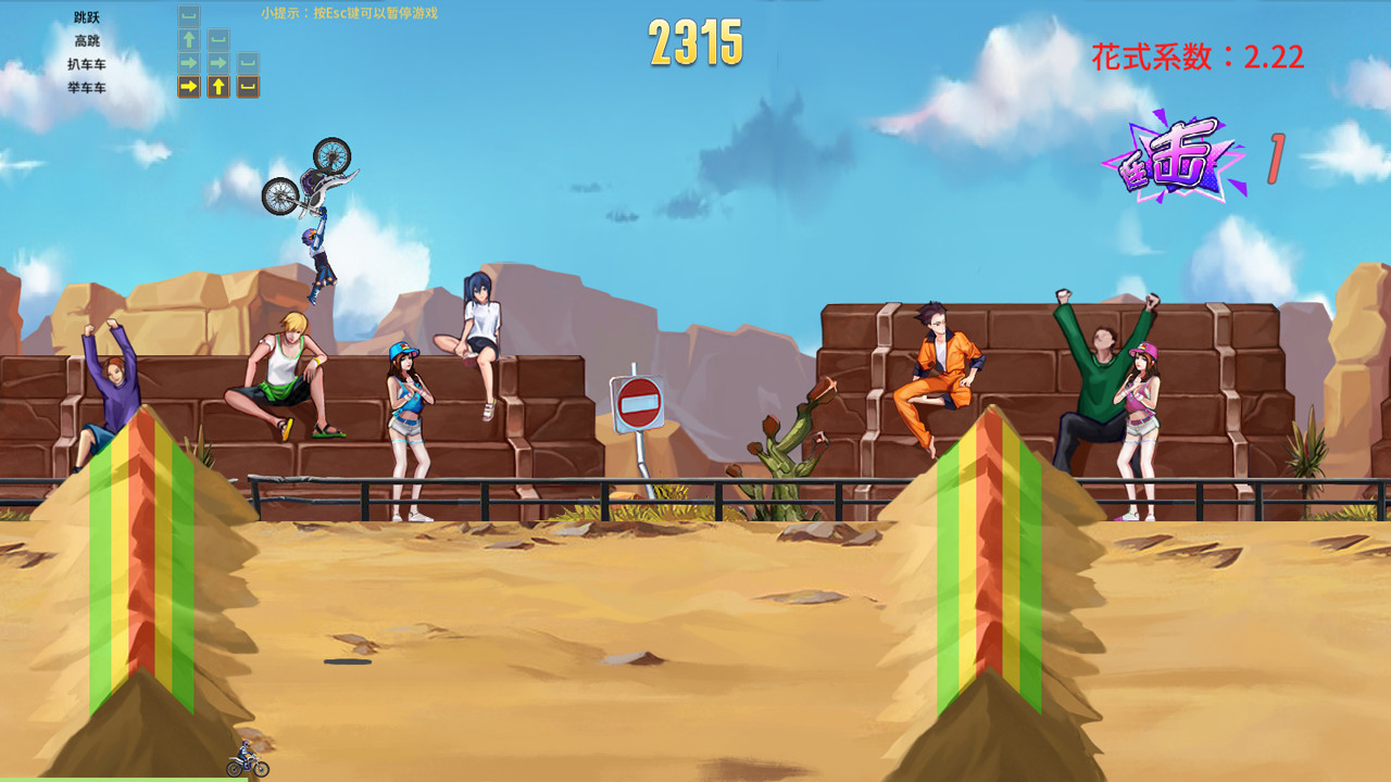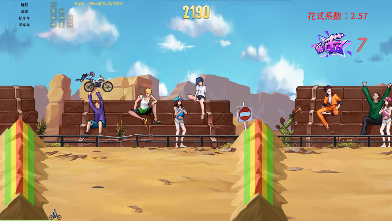 你将控制一个花式摩托手在赛道上随着音乐行驶。在节奏点,赛道上有一些土坡。你需要像玩格斗游戏一样用方向键(或WASD)搓招,并在土坡顶端起跳(按空格)。