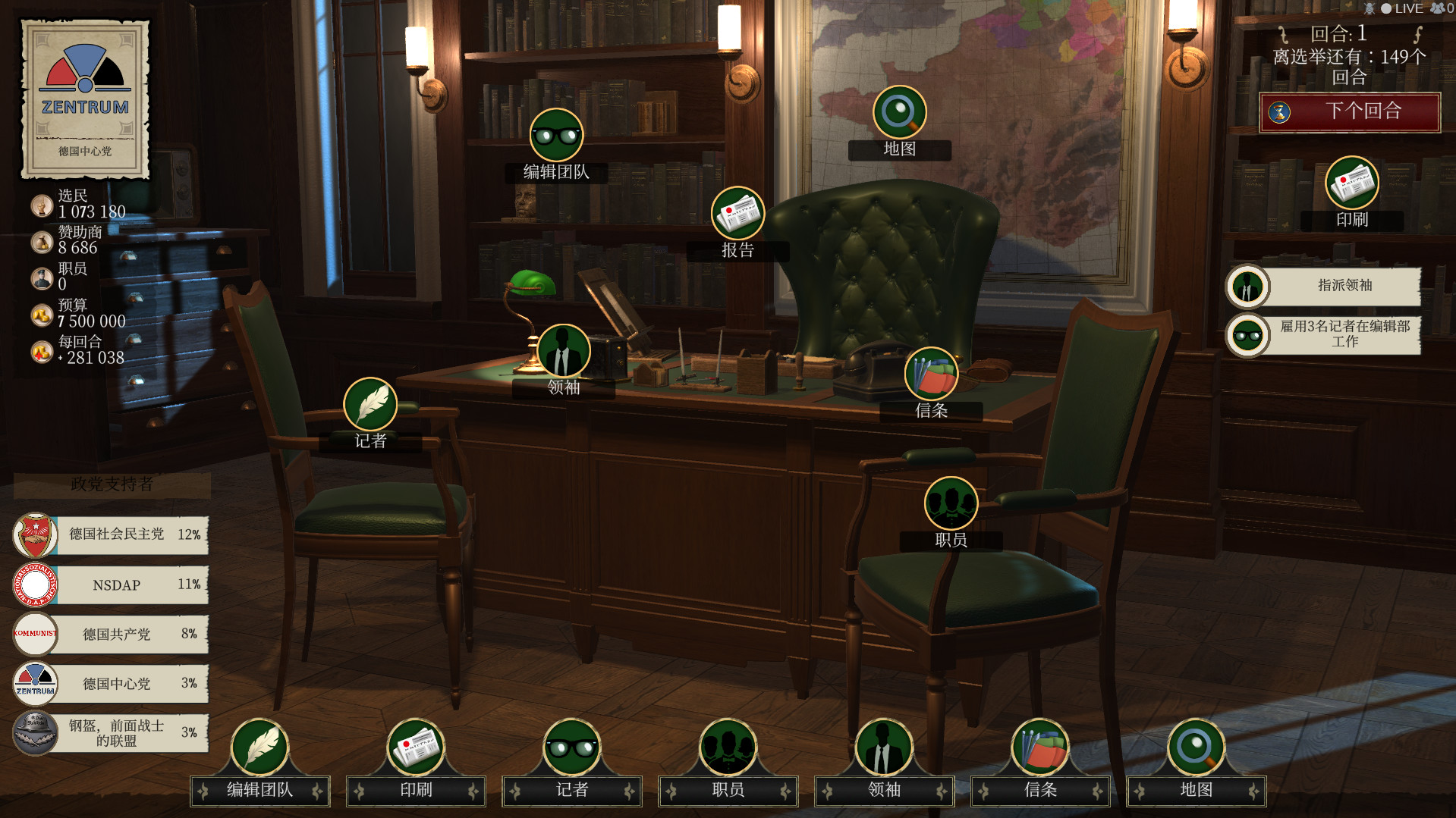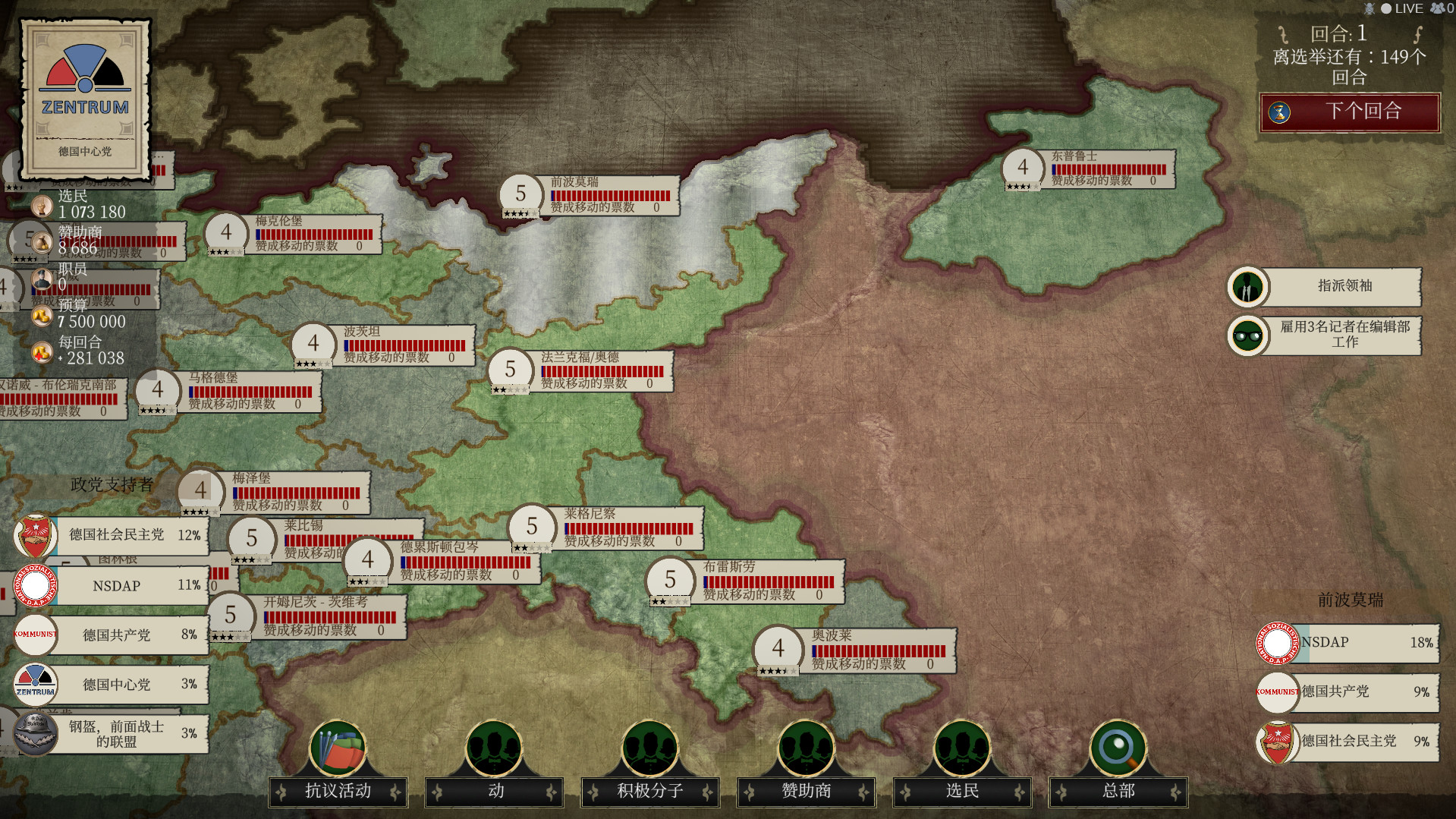 你将成为一个政党的领袖,你的目标是不让主要对手在选举中获胜。国家出现一个纳粹总理?不,这绝不能在我的任期内发生。 你可以自行决定使用哪种方式来达到最终目的。你是否将坚持只使用民主方式,或使用各类手段?你需要出版报纸,编写有关竞争对手的文章,发展宣传者,通过政党纲领。除此之外,还可以使用不太合法的方法来干扰选举结果,欺骗选民。 最后,只有你自己可以决定将成为哪个党派的领袖。