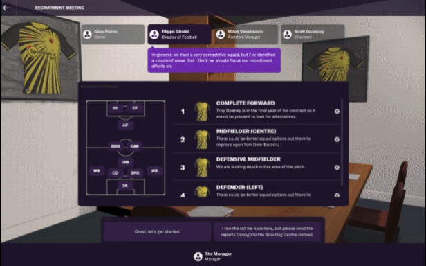 和你的教练团队一起分析球队阵容的强项与深度,再进入转会市场寻找补强选项。没准你的青训体系中就有一位正在期待进入一线队机会的未来巨星……
